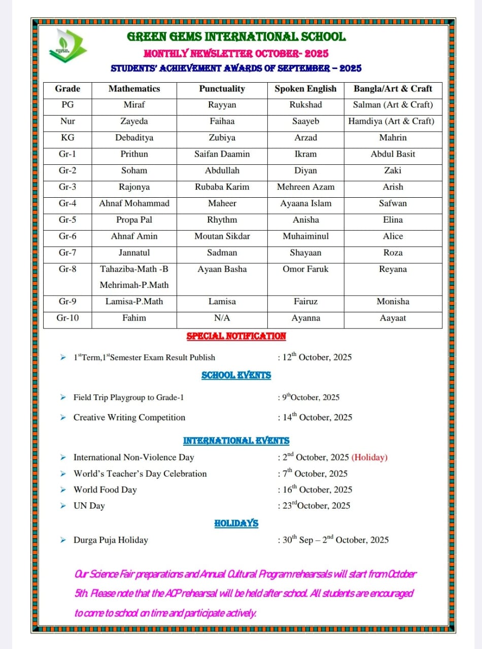 Green Gems International School is an English Language Middle School located in Dhanmondi, Dhaka. It follows the overseas syllabus of university of London, allowing its students to sit for IGCSE, O Level & A-Levels examinations.